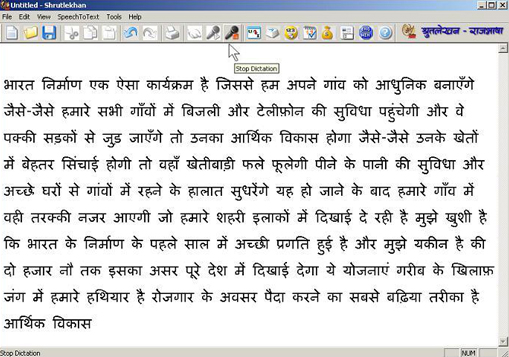 ShrutLekhan-Rajbhasha, a Hindi speaker independent, continuous speech recognition system is a milestone in the field of Speech technology that enables a machine to recognise human speech and provide an output in Hindi Unicode. This project has been developed by Applied AI Group, C-DAC, Pune for Department of Official Language [DOL], Ministry of Home Affairs, Government of India. ShrutLekhan-Rajbhasha is used as a tool in MANTRA-Rajbhasha (Machine Assisted Translation) system to correct the translated Hindi text. Recognizer improves recognition through the use of grammar (Language Module), which defines the vocabulary and syntax.
