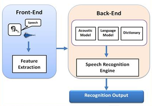 The user communicates with the application through the appropriate input device i.e. a microphone. The Recognizer converts the analog signal into digital signal for the speech processing. A stream of text is generated after the processing.